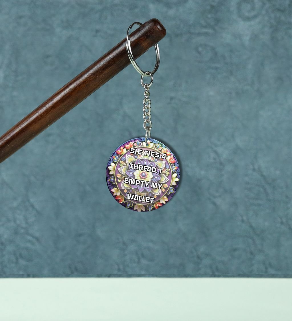 She Ties A Thread Funny Festival Quote Printed Round Keychain Pack of 2
