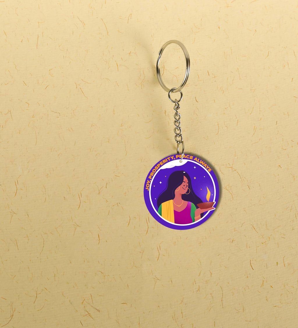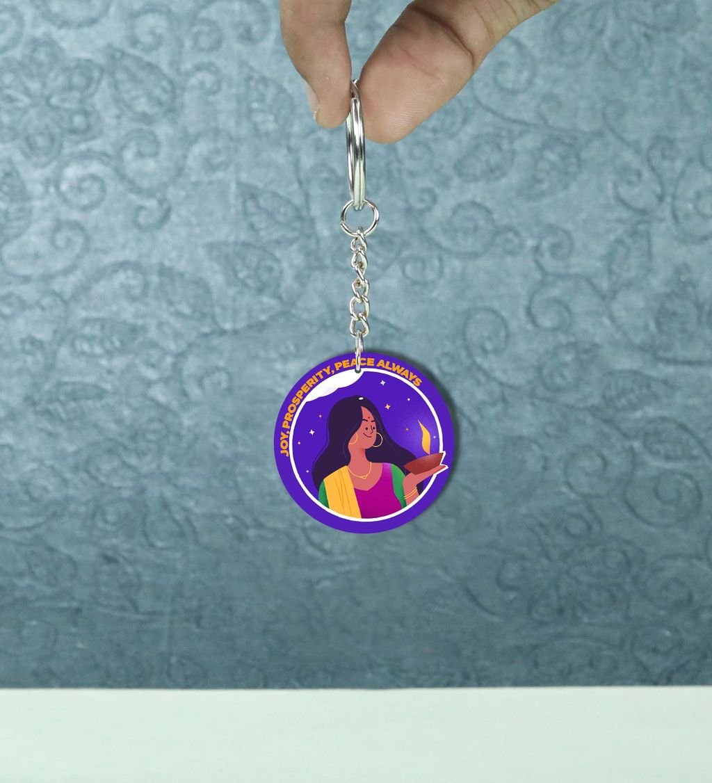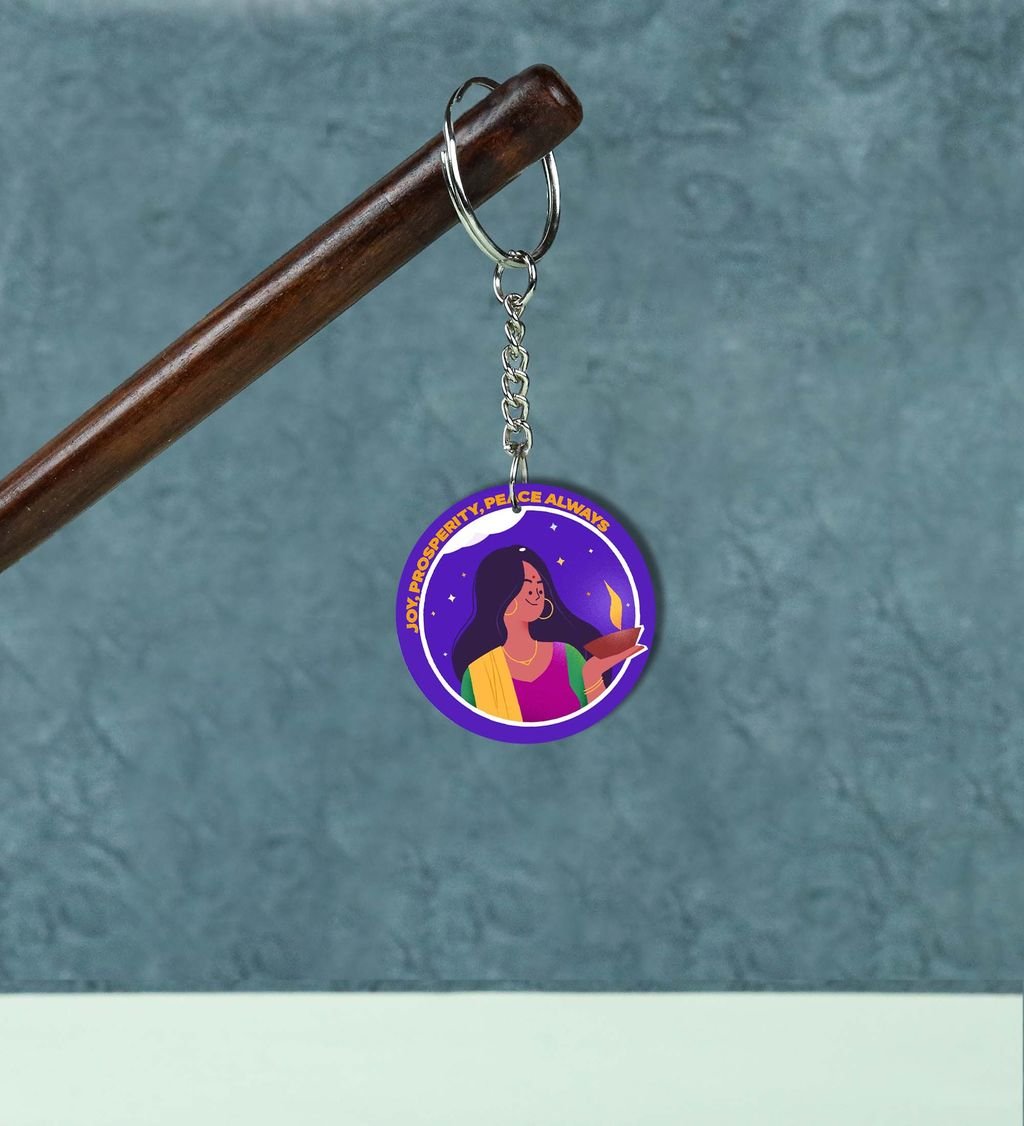 Woman with Diya Under Starry Sky Artwork Printed Round Keychain Pack of 2